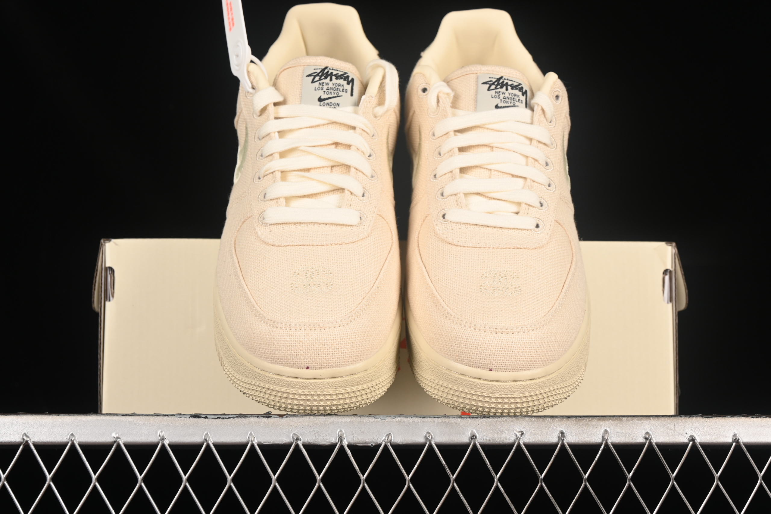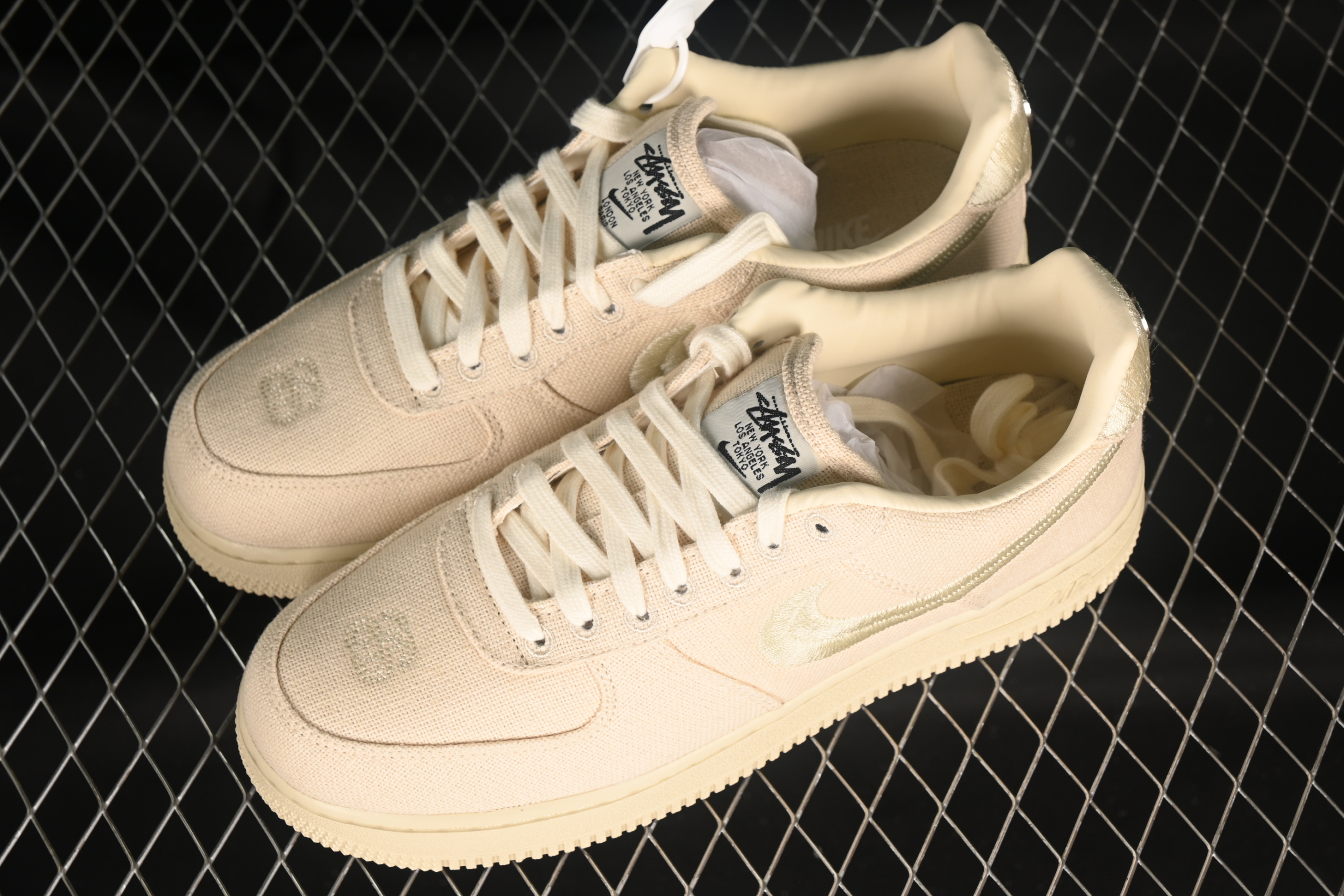 Логотип Nike выполнен объемной вышивкой, разделенной пополам, что является уникальной деталью данной коллаборации. Пятку украшает серебристая заклепка с логотипом Stussy, добавляя премиальности сдержанному дизайну.
